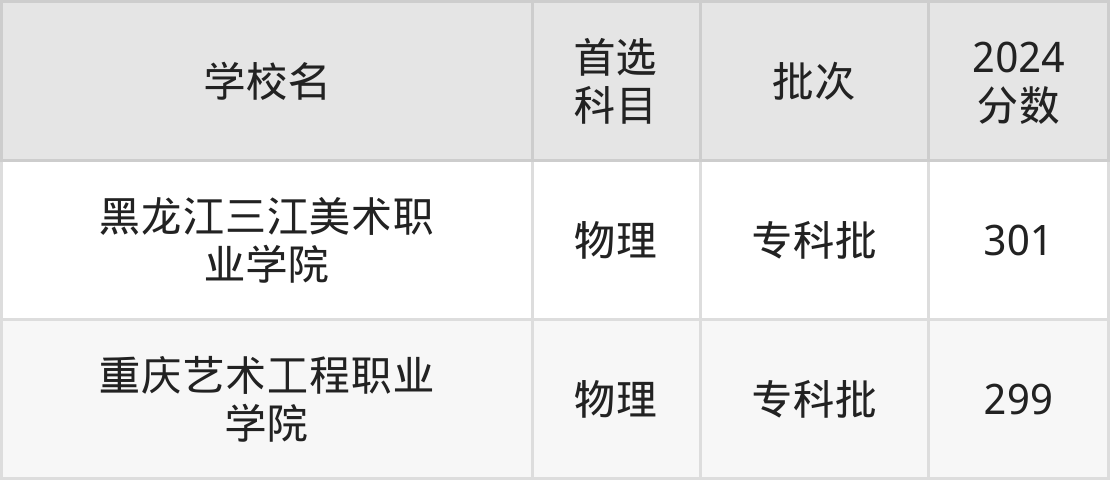 1、黑龙江三江美术职业学院(2024年物理类301分)