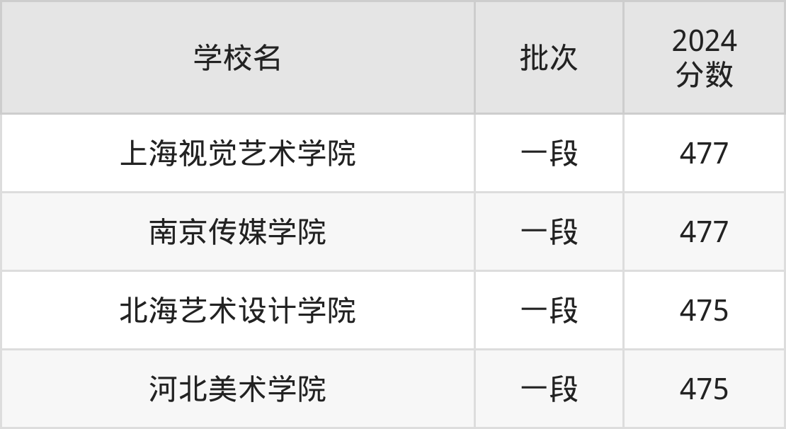 考生能上的有4所,全部在本科批次录取。具体有:上海视觉艺术学院(477分)、南京传媒学院(477分)、北海艺术设计学院(475分)、河北美术学院(475分)等。