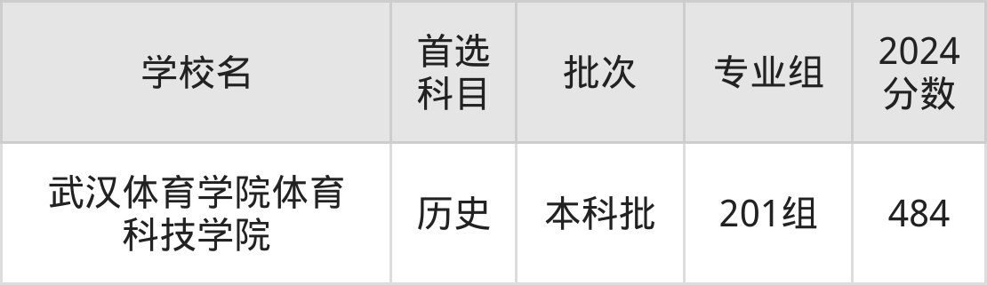 首选历史科目考生能上的有1所,全部在本科批次录取。具体有:武汉体育学院体育科技学院201组(484分)。