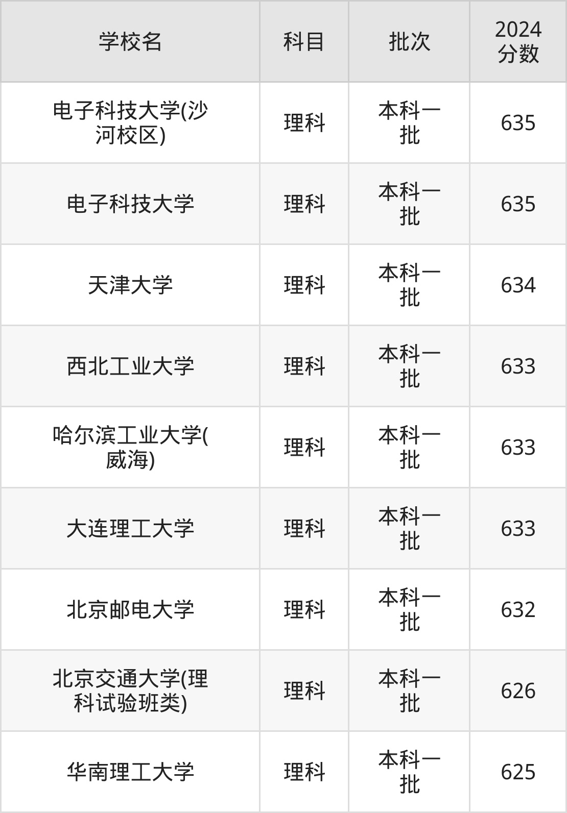 理科科目考生能上的有9所,全部在本科批次录取。具体有:电子科技大学(沙河校区)(635分)、电子科技大学(635分)、天津大学(634分)、西北工业大学(633分)等。