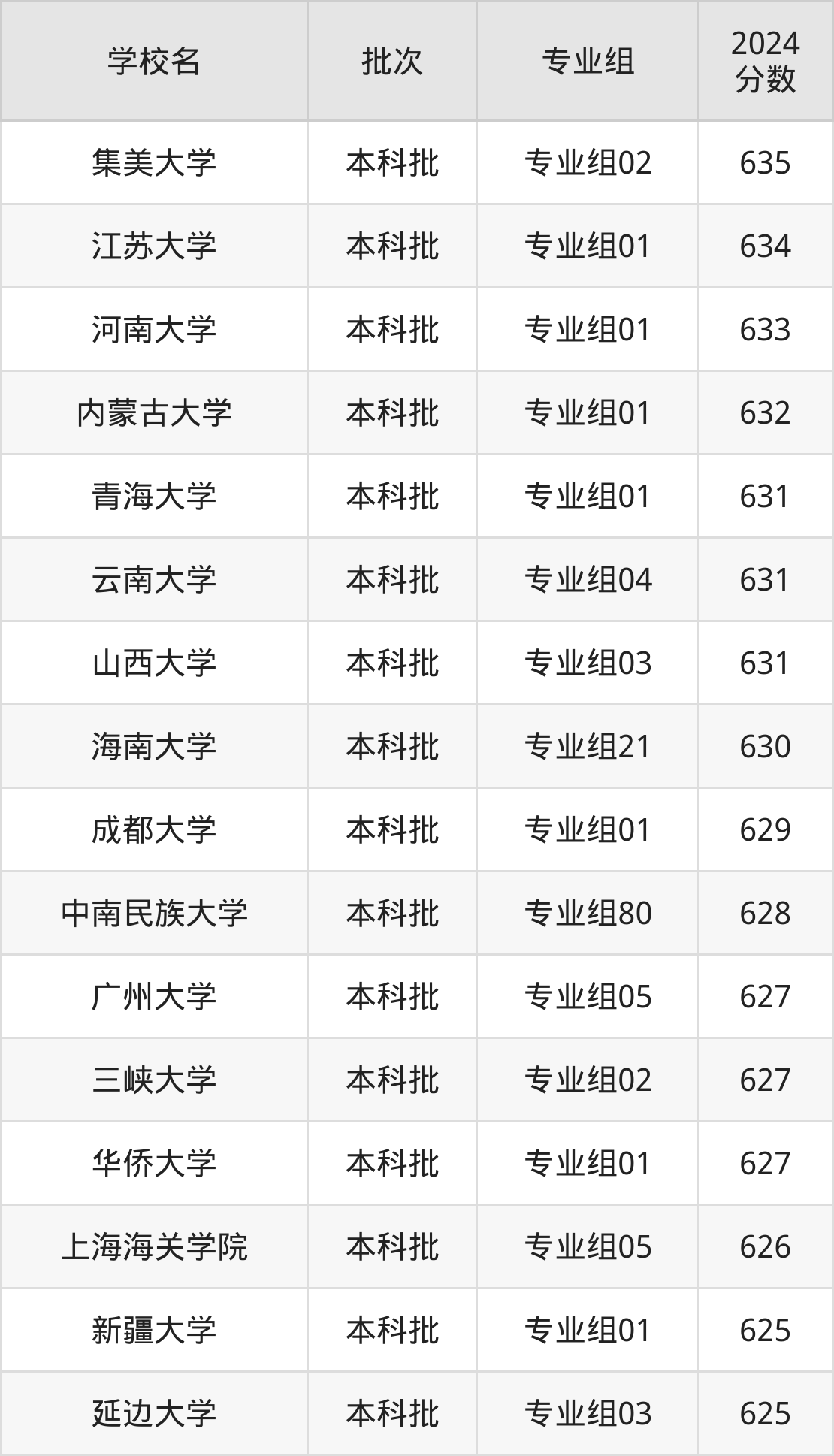 为给各位考生更加详细的参考,下文整理了2024年录取分数线在625分到635分之间的综合类大学名单汇总。