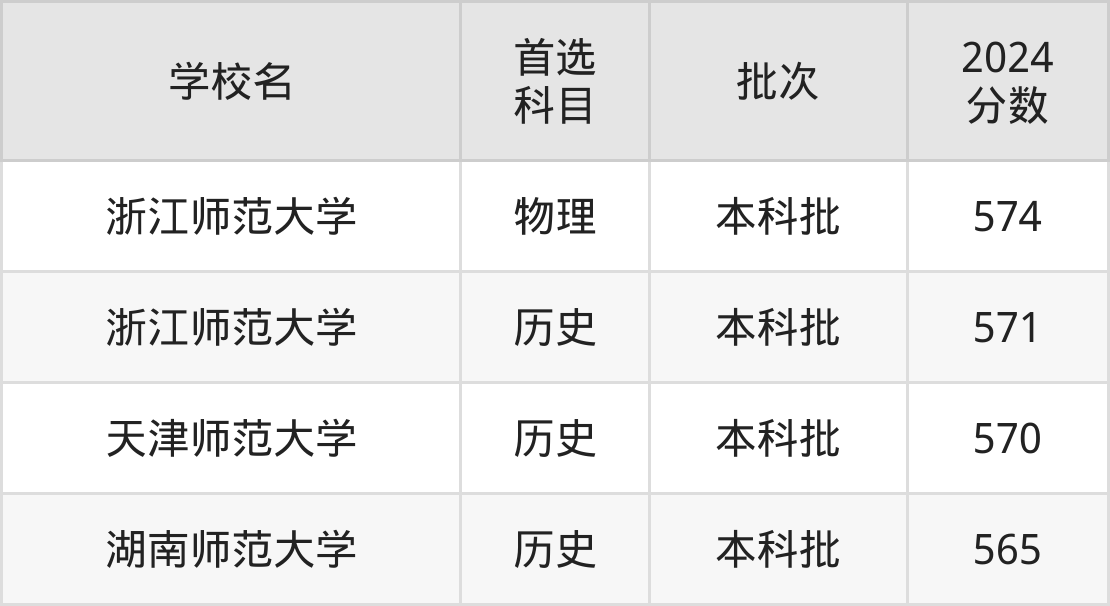 首选历史科目考生能上的有3所,全部在本科批次录取。具体有:浙江师范大学(571分)、天津师范大学(570分)、湖南师范大学(565分)。