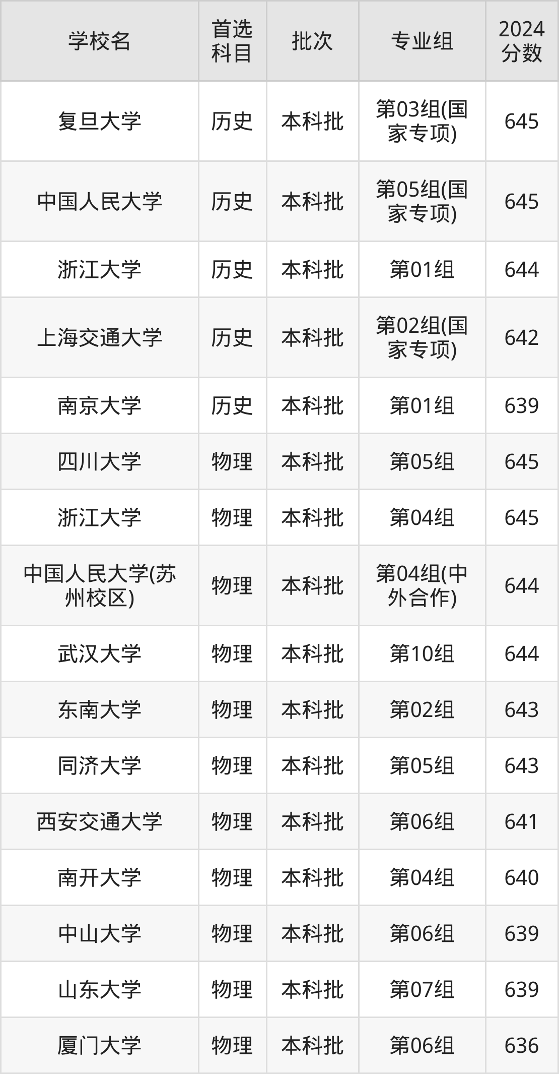 首选历史科目考生能上的有5所,全部在本科批次录取。具体有:复旦大学第03组(国家专项)(645分)、中国人民大学第05组(国家专项)(645分)、浙江大学第01组(644分)、上海交通大学第02组(国家专项)(642分)等;