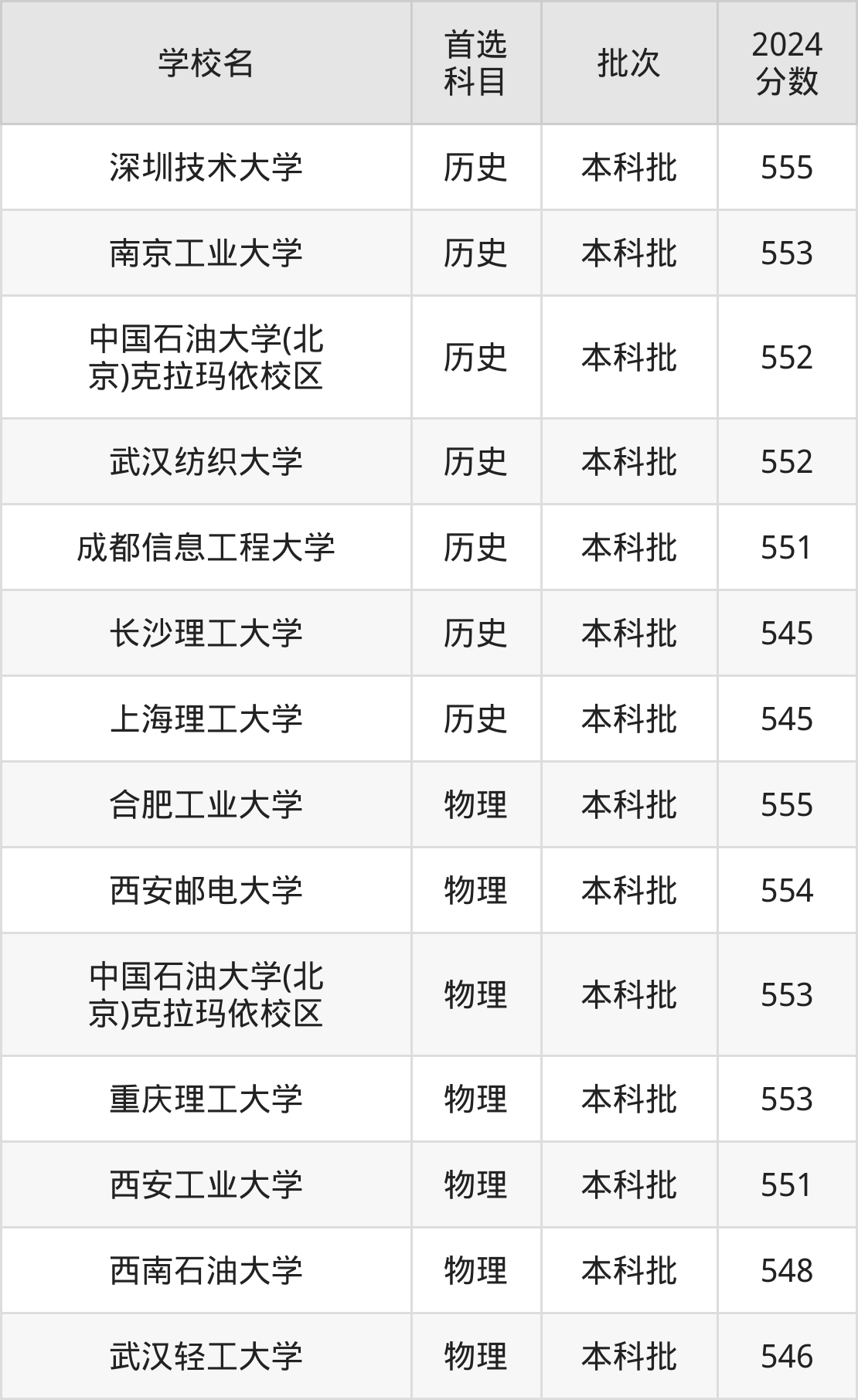 首选历史科目考生能上的有7所,全部在本科批次录取。具体有:深圳技术大学(555分)、南京工业大学(553分)、中国石油大学(北京)克拉玛依校区(552分)、武汉纺织大学(552分)等;
