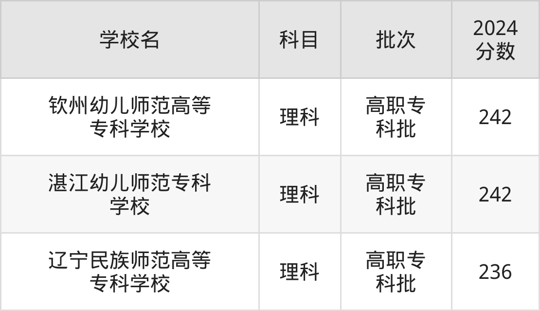理科科目考生能上的有3所,全部在专科批次录取。具体有:钦州幼儿师范高等专科学校(242分)、湛江幼儿师范专科学校(242分)、辽宁民族师范高等专科学校(236分)。