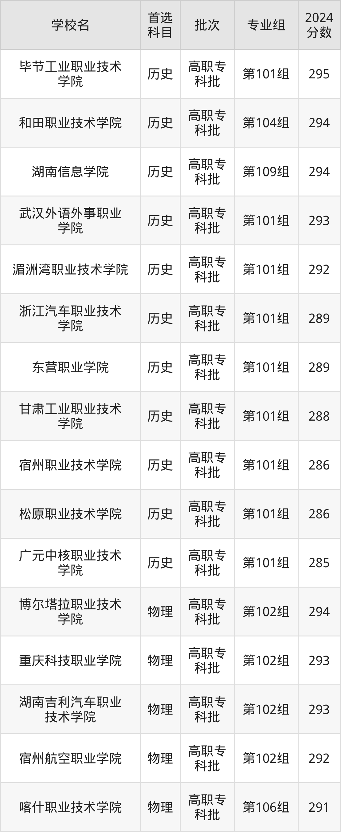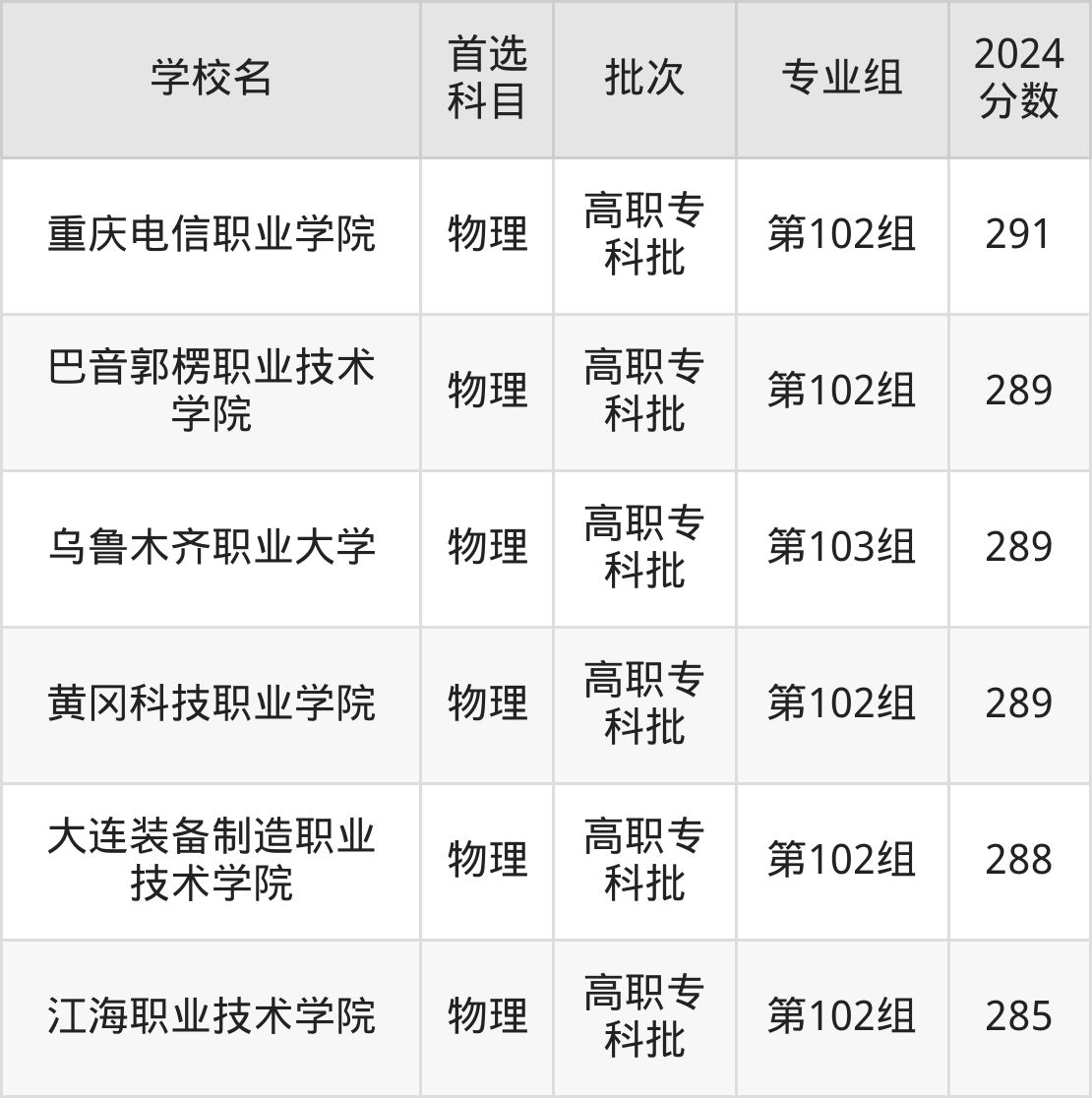 首选物理科目考生能上的有11所,全部在专科批次录取。具体有:博尔塔拉职业技术学院第102组(294分)、重庆科技职业学院第102组(293分)、湖南吉利汽车职业技术学院第102组(293分)、宿州航空职业学院第102组(292分)等。