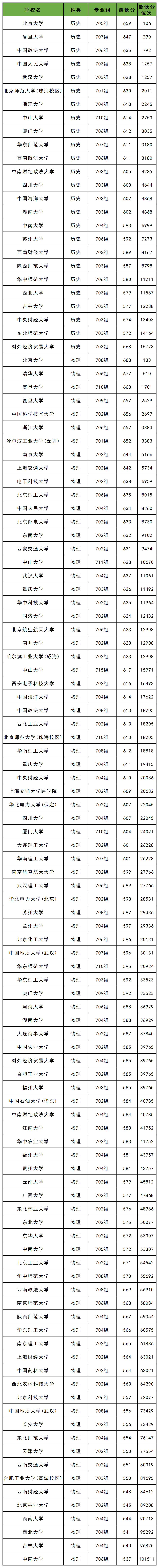 物理类收分最低的是中南大学706组;历史类收分最低的是对外经济贸易大学703组。另外广东高校专项计划录取分数线最高的大学:历史类为北京大学(705组,659分);物理类为北京大学(708组,688分)。