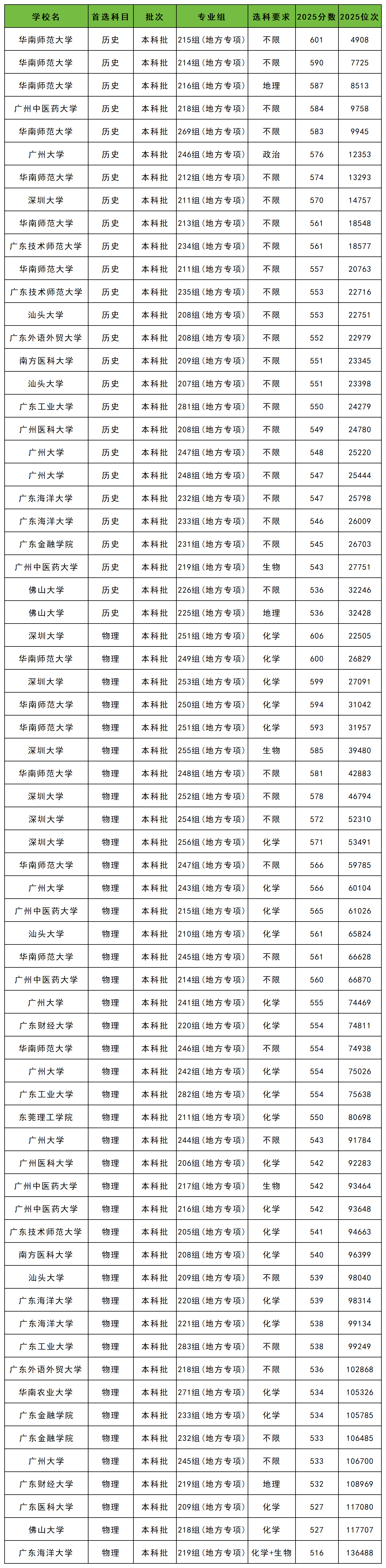 2025年广东地方专项计划最低录取分数线:历史类536分、物理类516分。