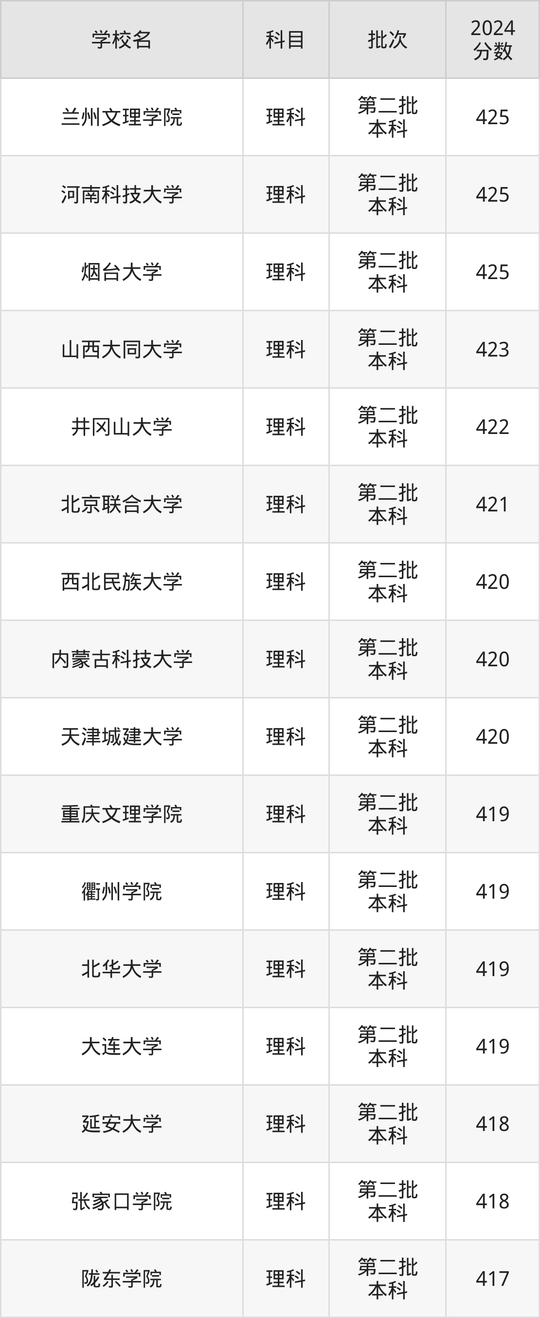 理科科目考生能上的有27所,全部在本科批次录取。具体有:兰州文理学院(425分)、河南科技大学(425分)、烟台大学(425分)、山西大同大学(423分)等;