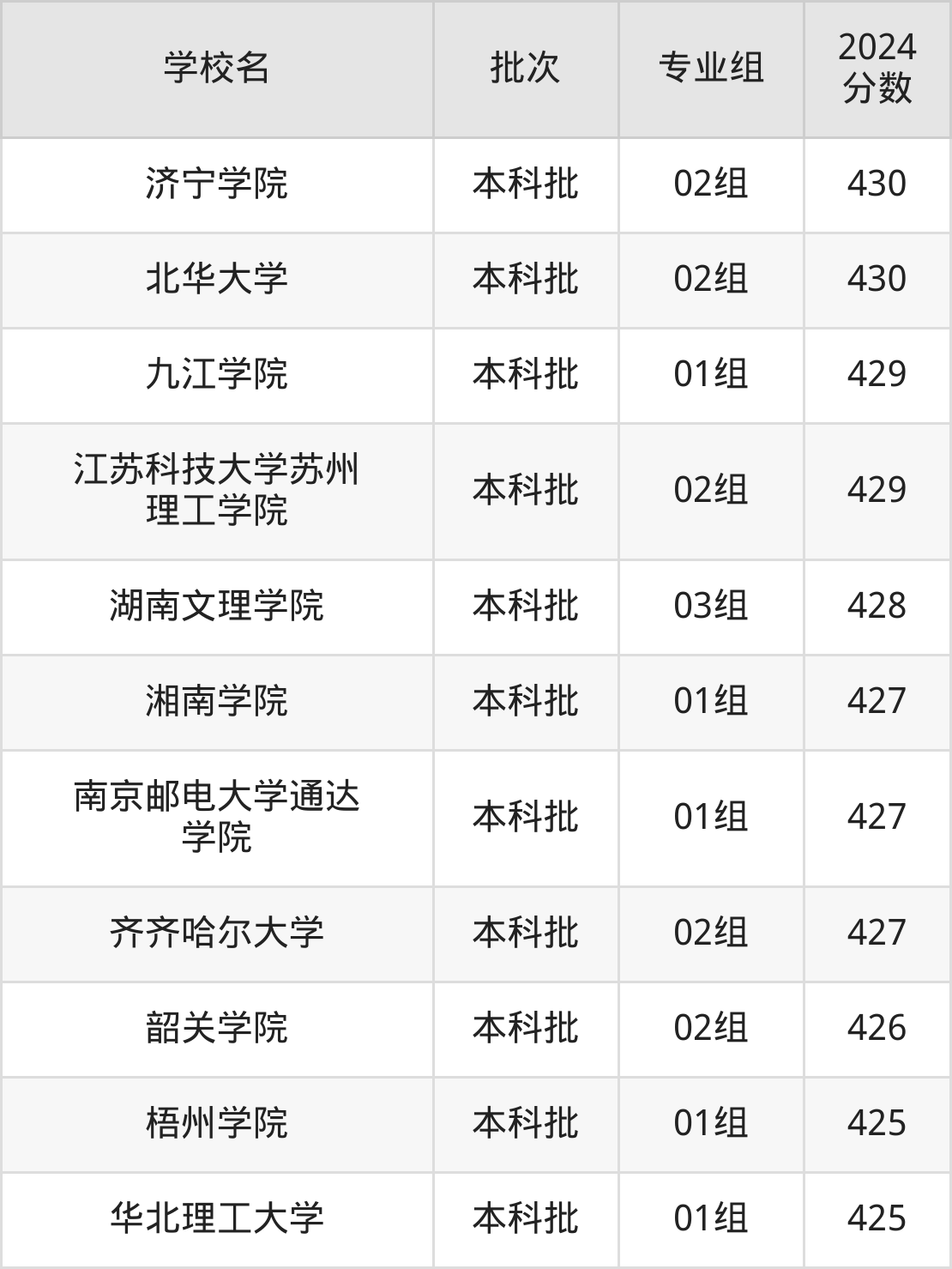 根据2024年高考招录数据,录取分数线刚好为430分的综合类大学有济宁学院、北华大学。下面是这些学校的相关介绍: