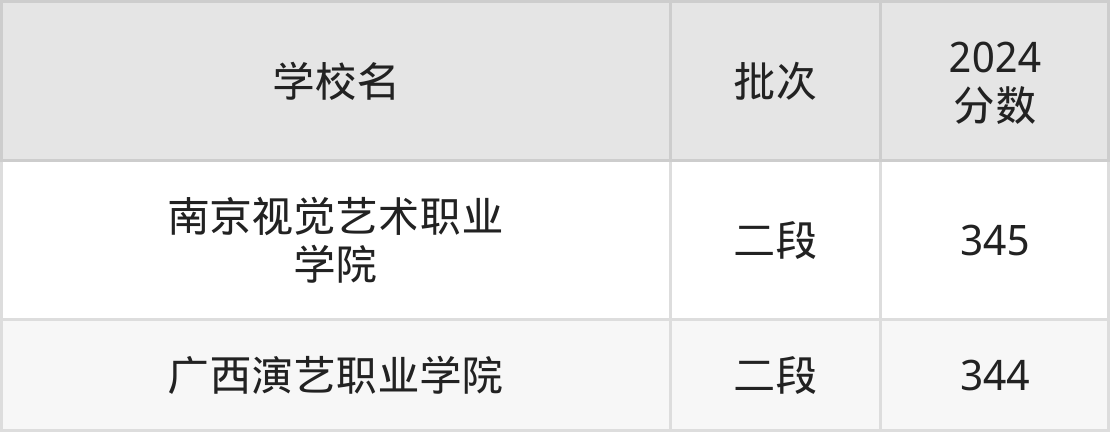 考生能上的有2所,全部在专科批次录取。具体有:南京视觉艺术职业学院(345分)、广西演艺职业学院(344分)。