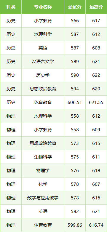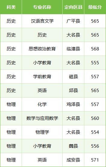 历史类:555分,对应专业为小学教育,定向大名县就业;