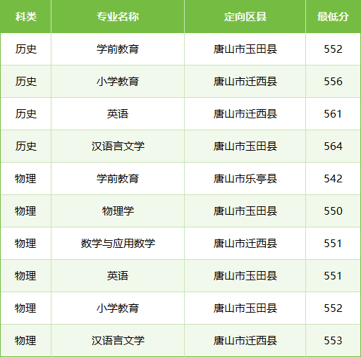 历史类:552分,对应专业为学前教育,定向唐山市玉田县就业;