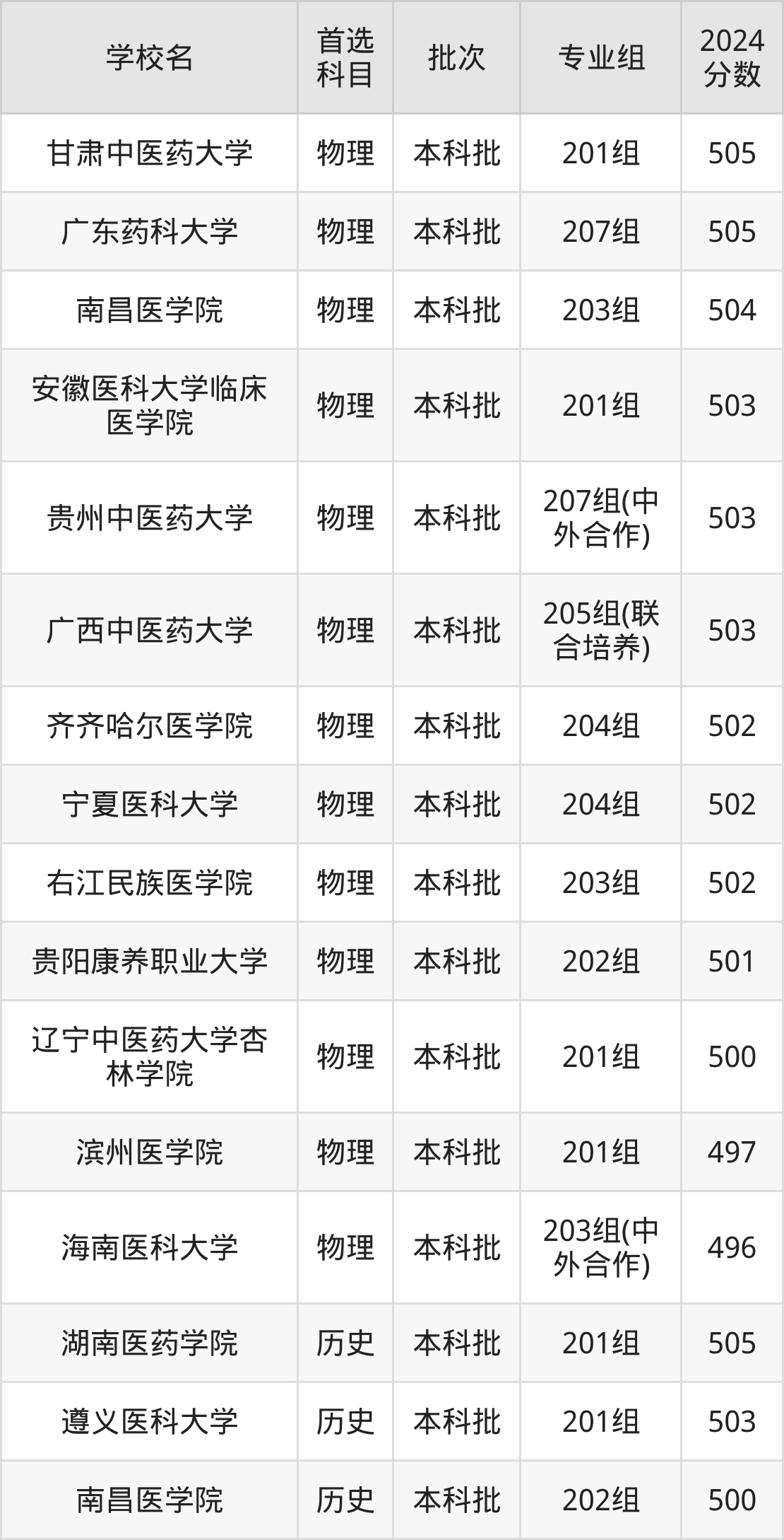 首选物理科目考生能上的有13所,全部在本科批次录取。具体有:甘肃中医药大学201组(505分)、广东药科大学207组(505分)、南昌医学院203组(504分)、安徽医科大学临床医学院201组(503分)等;