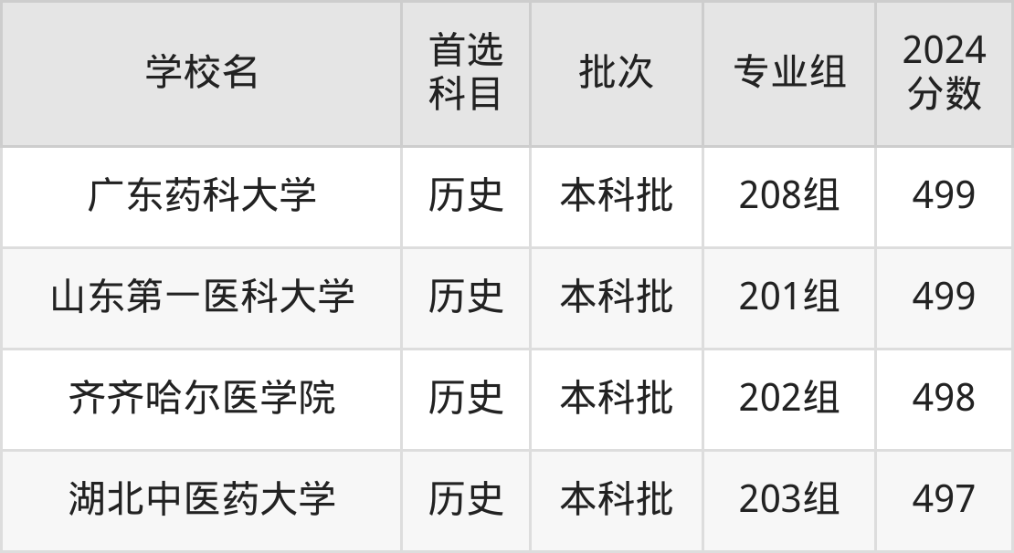 首选历史科目考生能上的有7所,全部在本科批次录取。具体有:湖南医药学院201组(505分)、遵义医科大学201组(503分)、南昌医学院202组(500分)、广东药科大学208组(499分)等。
