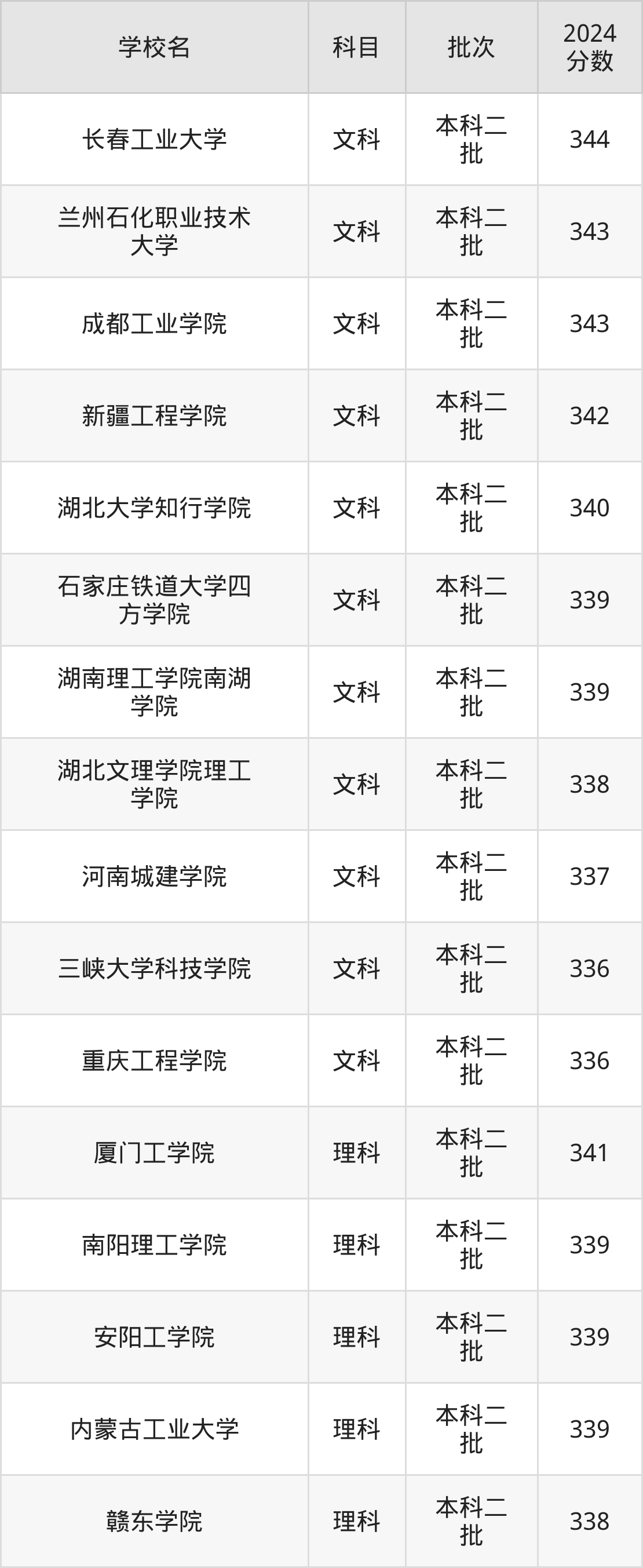 文科科目考生能上的有11所,全部在本科批次录取。具体有:长春工业大学(344分)、兰州石化职业技术大学(343分)、成都工业学院(343分)、新疆工程学院(342分)等;