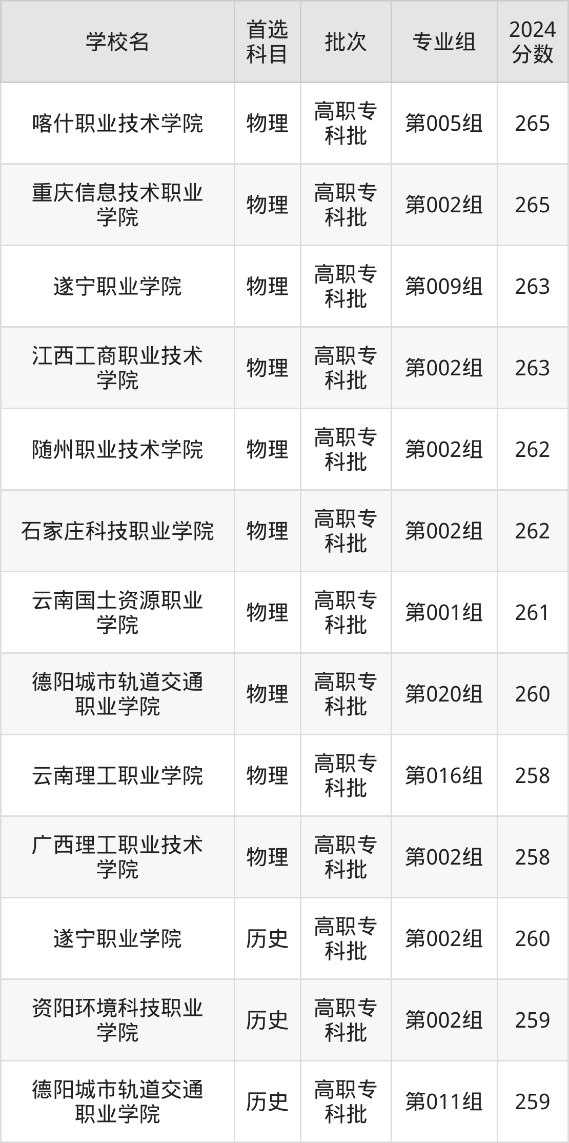 首选历史科目考生能上的有3所,全部在专科批次录取。具体有:遂宁职业学院第002组(260分)、资阳环境科技职业学院第002组(259分)、德阳城市轨道交通职业学院第011组(259分)。
