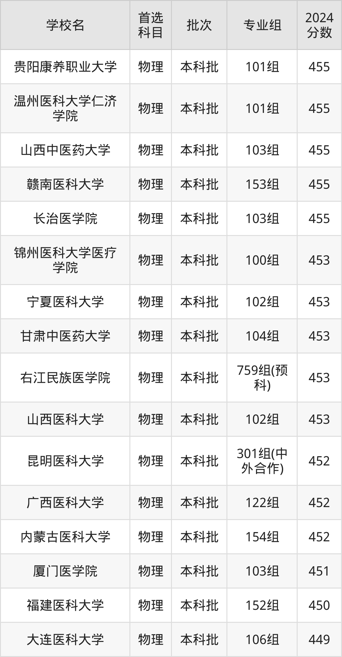 首选物理科目考生能上的有23所,全部在本科批次录取。具体有:贵阳康养职业大学101组(455分)、温州医科大学仁济学院101组(455分)、山西中医药大学103组(455分)、赣南医科大学153组(455分)等;
