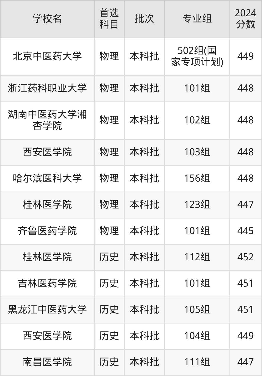 首选历史科目考生能上的有5所,全部在本科批次录取。具体有:桂林医学院112组(452分)、吉林医药学院101组(451分)、黑龙江中医药大学105组(451分)、西安医学院104组(449分)等。