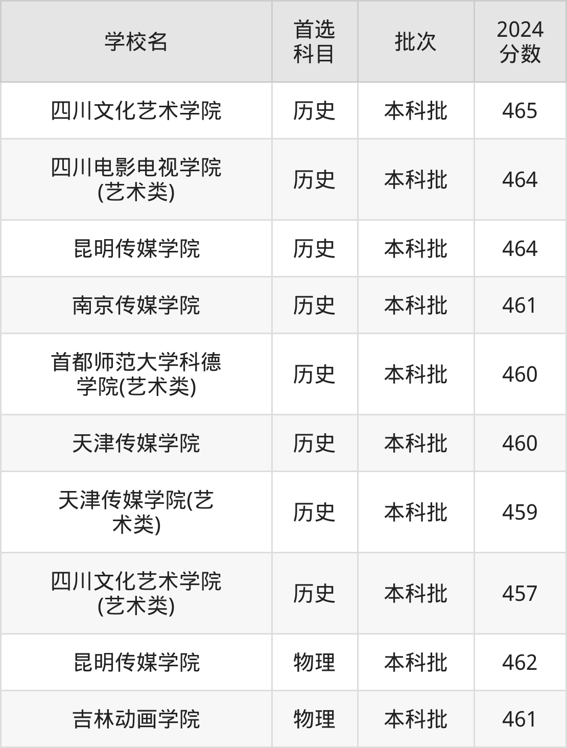 首选历史科目考生能上的有8所,全部在本科批次录取。具体有:四川文化艺术学院(465分)、四川电影电视学院(艺术类)(464分)、昆明传媒学院(464分)、南京传媒学院(461分)等;