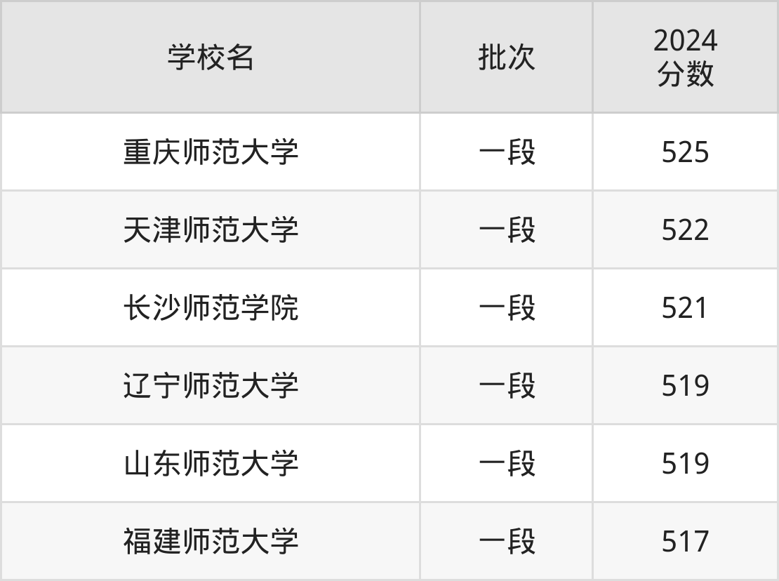为给各位考生更加详细的参考,下文整理了2024年录取分数线在515分到525分之间的师范类大学名单汇总。