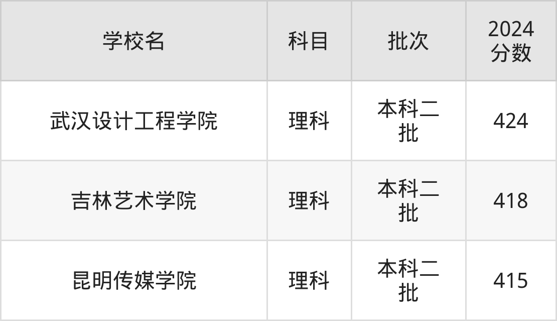 理科科目考生能上的有3所,全部在本科批次录取。具体有:武汉设计工程学院(424分)、吉林艺术学院(418分)、昆明传媒学院(415分)。