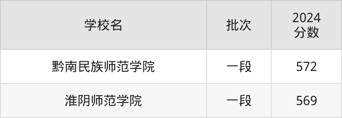 考生能上的有2所,全部在本科批次录取。具体有:黔南民族师范学院(572分)、淮阴师范学院(569分)。