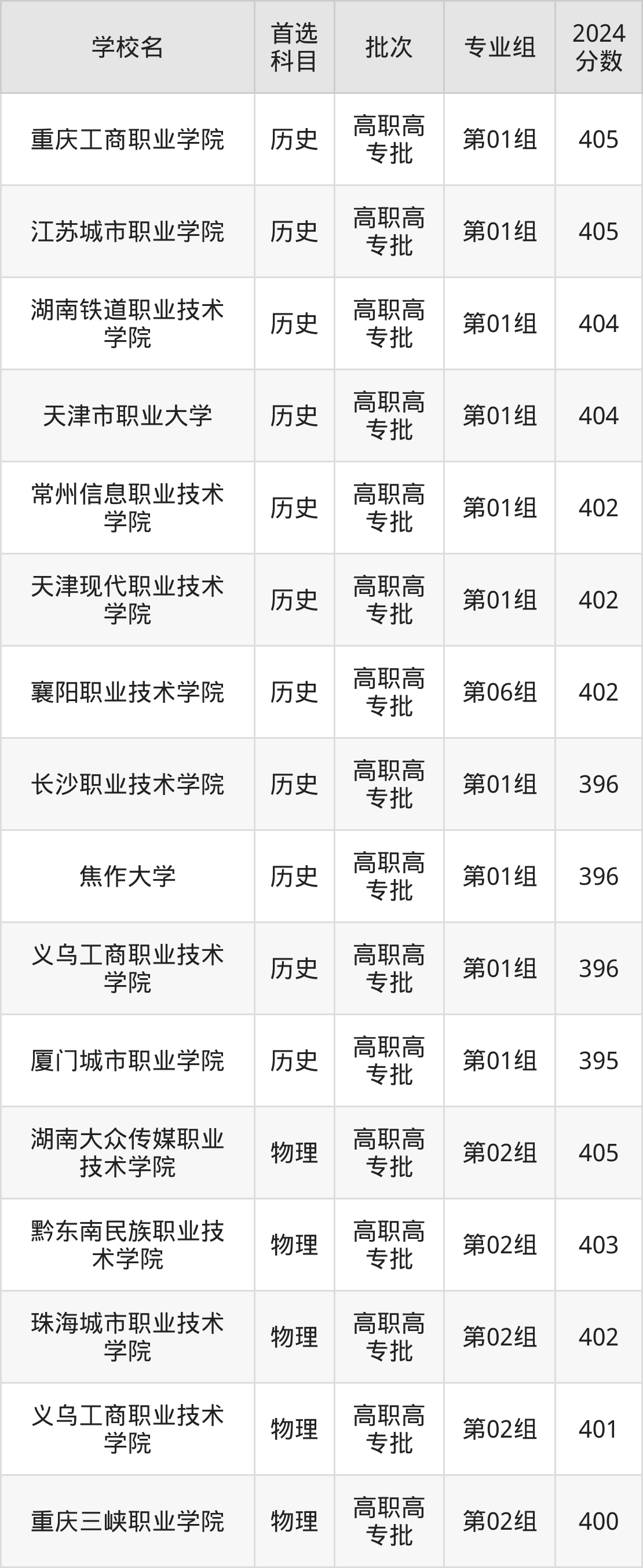 首选物理科目考生能上的有14所,全部在专科批次录取。具体有:湖南大众传媒职业技术学院第02组(405分)、黔东南民族职业技术学院第02组(403分)、珠海城市职业技术学院第02组(402分)、义乌工商职业技术学院第02组(401分)等。