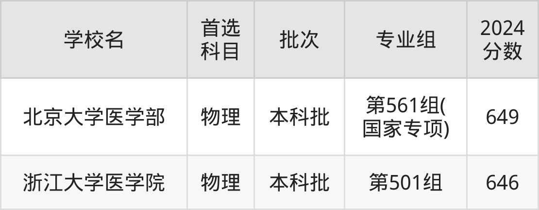 首选物理科目考生能上的有2所,全部在本科批次录取。具体有:北京大学医学部第561组(国家专项)(649分)、浙江大学医学院第501组(646分)。
