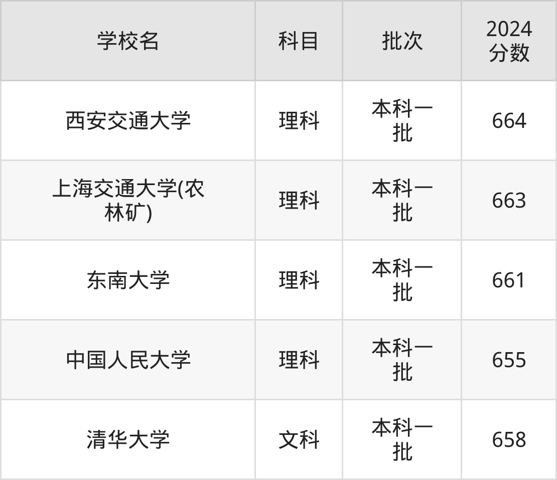 理科科目考生能上的有4所,全部在本科批次录取。具体有:西安交通大学(664分)、上海交通大学(农林矿)(663分)、东南大学(661分)、中国人民大学(655分)等;