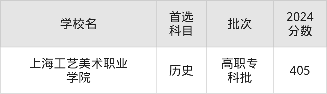 首选历史科目考生能上的有1所,全部在专科批次录取。具体有:上海工艺美术职业学院(405分)。