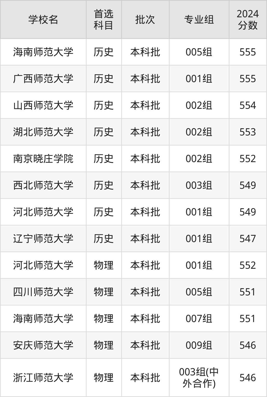 首选历史科目考生能上的有8所,全部在本科批次录取。具体有:海南师范大学005组(555分)、广西师范大学001组(555分)、山西师范大学002组(554分)、湖北师范大学002组(553分)等;