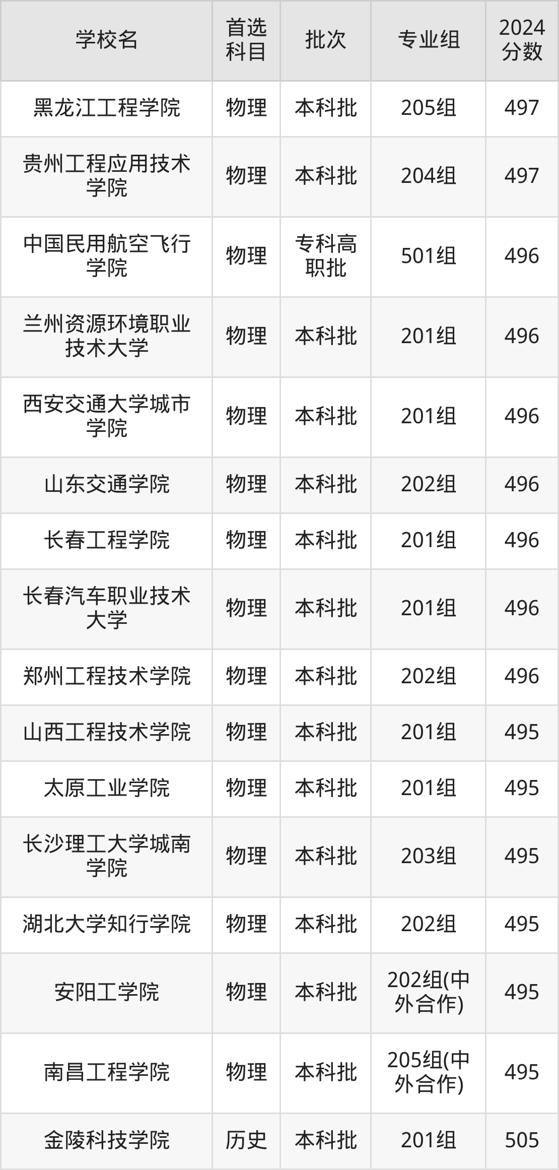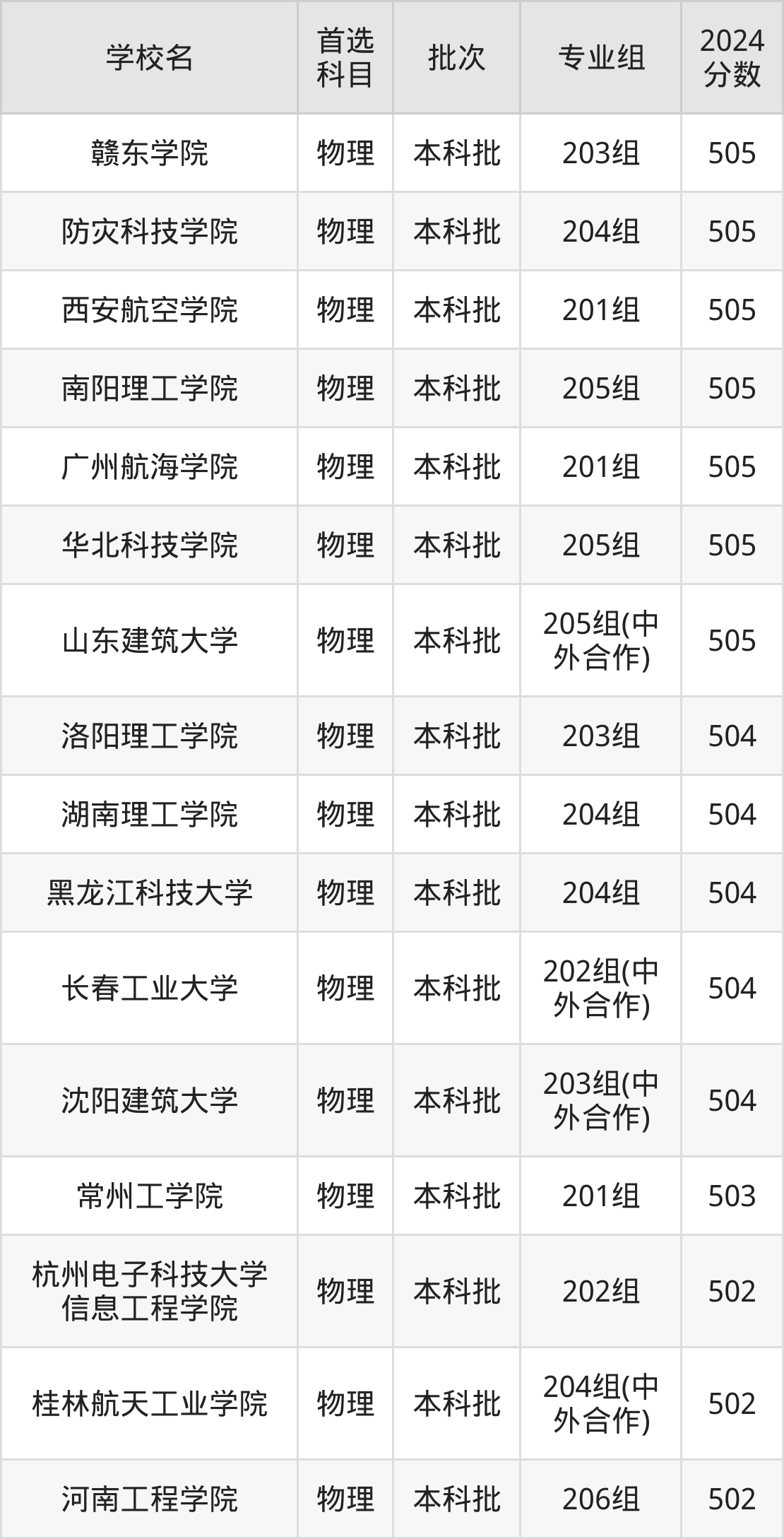 首选物理科目考生能上的有47所,全部在本科批次录取。具体有:赣东学院203组(505分)、防灾科技学院204组(505分)、西安航空学院201组(505分)、南阳理工学院205组(505分)等;