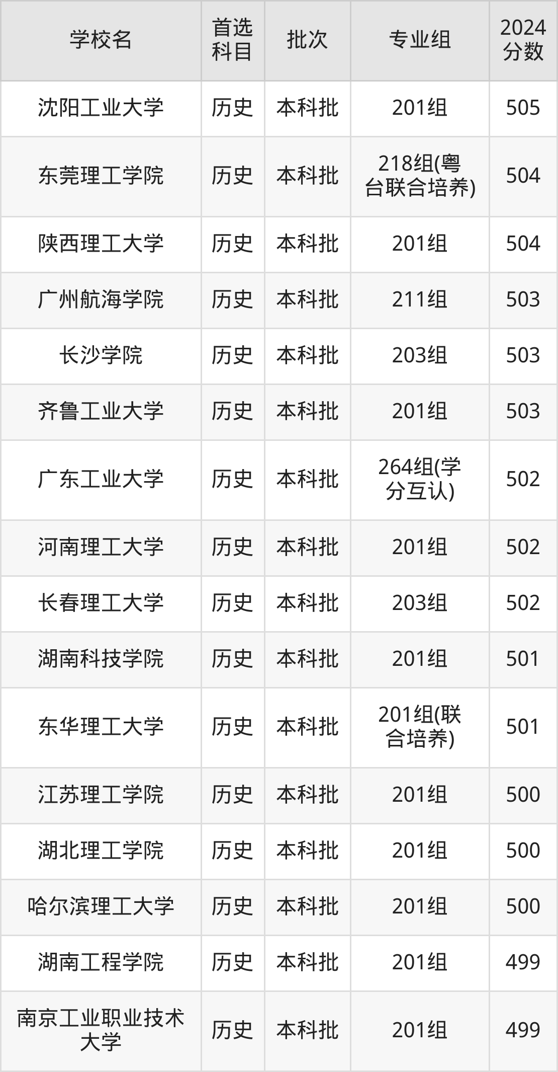 首选历史科目考生能上的有30所,全部在本科批次录取。具体有:金陵科技学院201组(505分)、沈阳工业大学201组(505分)、东莞理工学院218组(粤台联合培养)(504分)、陕西理工大学201组(504分)等。