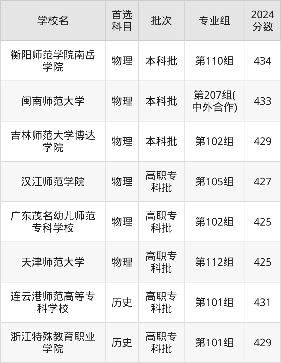 首选历史科目考生能上的有2所,全部在专科批次录取。具体有:连云港师范高等专科学校第101组(431分)、浙江特殊教育职业学院第101组(429分)。