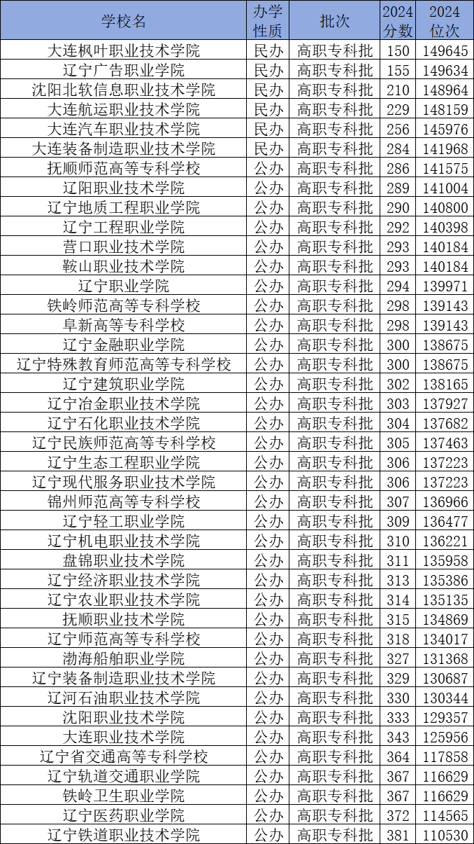 录取分数线最低、最好考的专科高校是大连枫叶职业技术学院、辽宁广告职业学院,2024最低分数线为150分,位次为149645名。