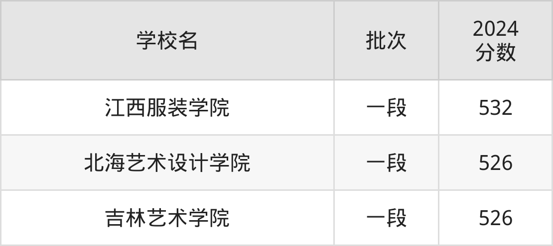 考生能上的有3所,全部在本科批次录取。具体有:江西服装学院(532分)、北海艺术设计学院(526分)、吉林艺术学院(526分)。