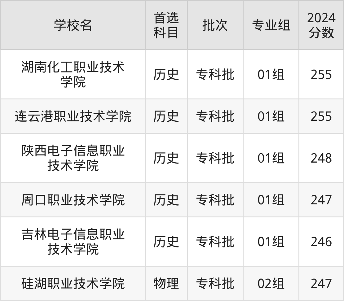 首选历史科目考生能上的有5所,全部在专科批次录取。具体有:湖南化工职业技术学院01组(255分)、连云港职业技术学院01组(255分)、陕西电子信息职业技术学院01组(248分)、周口职业技术学院01组(247分)等;