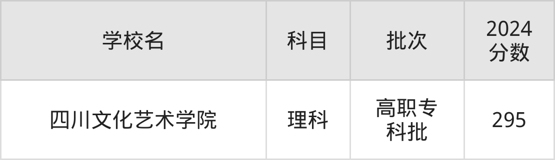 理科科目考生能上的有1所,全部在本科批次录取。具体有:四川文化艺术学院(295分)。