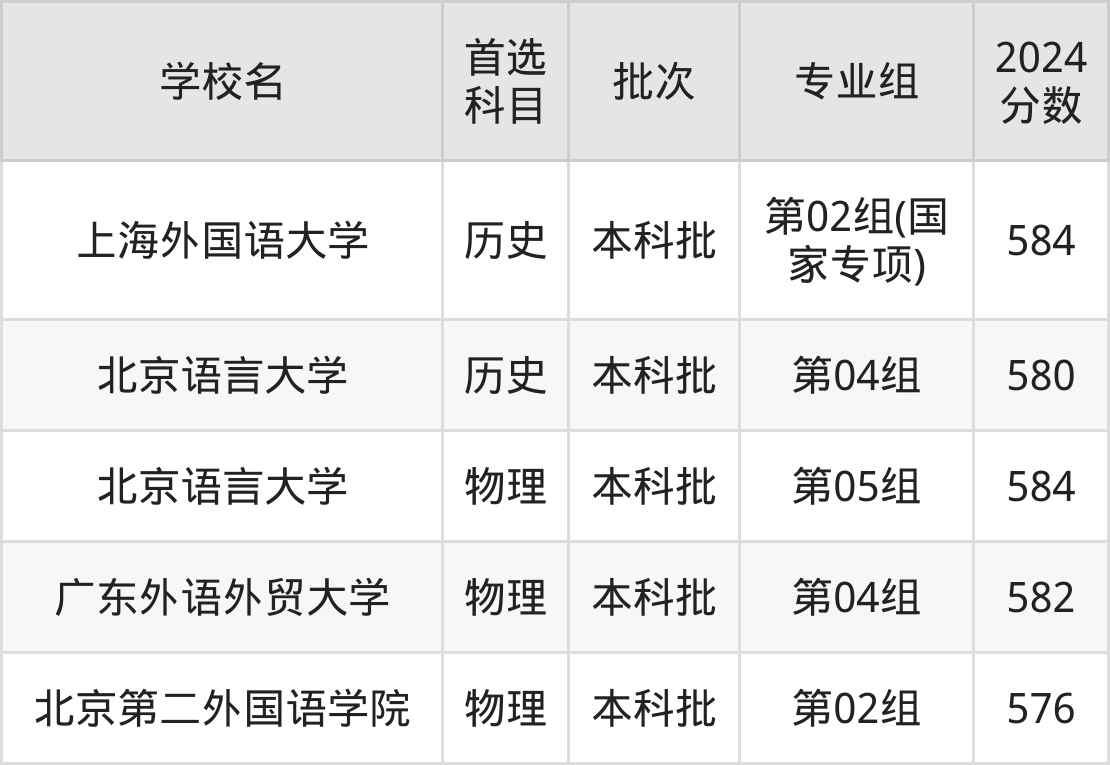 首选物理科目考生能上的有3所,全部在本科批次录取。具体有:北京语言大学第05组(584分)、广东外语外贸大学第04组(582分)、北京第二外国语学院第02组(576分)。