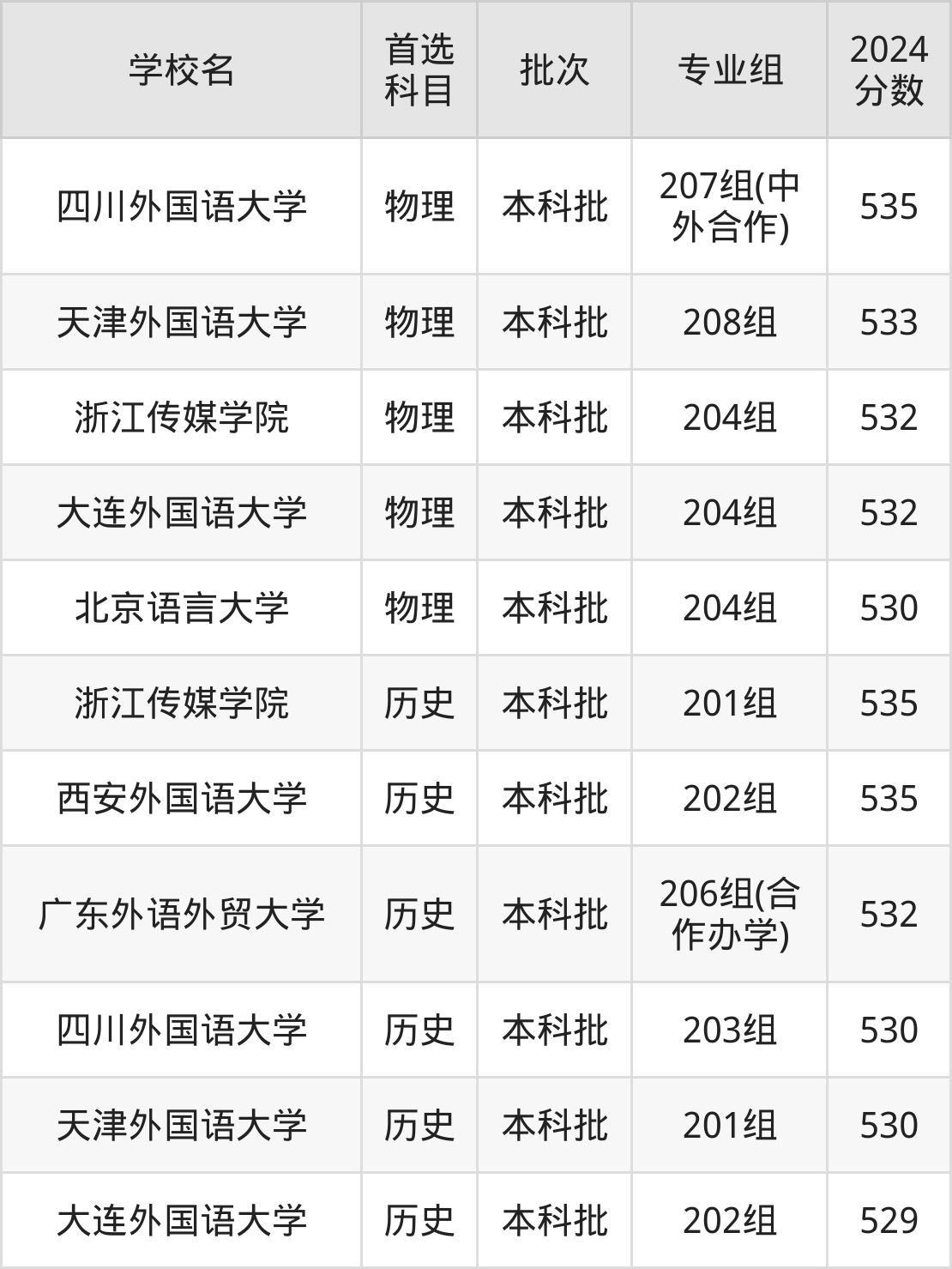 首选物理科目考生能上的有5所,全部在本科批次录取。具体有:四川外国语大学207组(中外合作)(535分)、天津外国语大学208组(533分)、浙江传媒学院204组(532分)、大连外国语大学204组(532分)等;