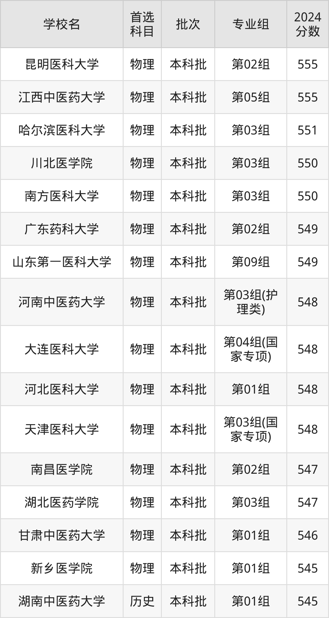 首选物理科目考生能上的有15所,全部在本科批次录取。具体有:昆明医科大学第02组(555分)、江西中医药大学第05组(555分)、哈尔滨医科大学第03组(551分)、川北医学院第03组(550分)等;