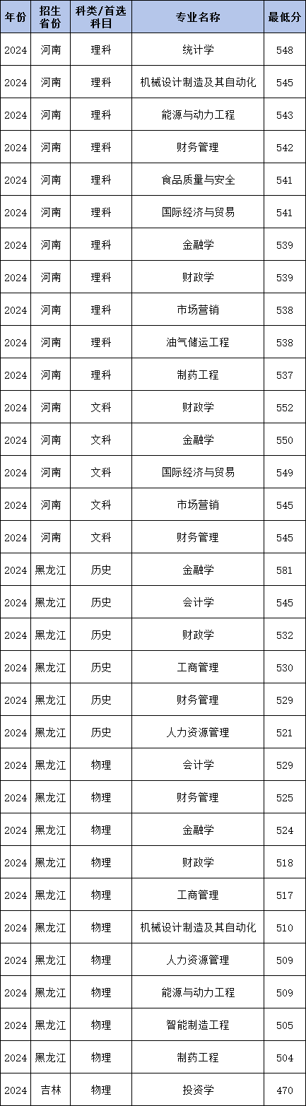 2024年哈尔滨商业大学国家专项计划在吉林录取最低分物理类为470分,物理组收分最低的专业为投资学。