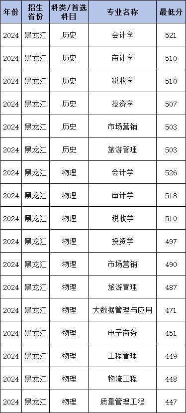2024年哈尔滨商业大学地方专项计划在黑龙江录取最低分历史类为503分、物理类为447分,历史组收分最低的专业为市场营销和旅游管理、物理组收分最低的专业为质量管理工程。