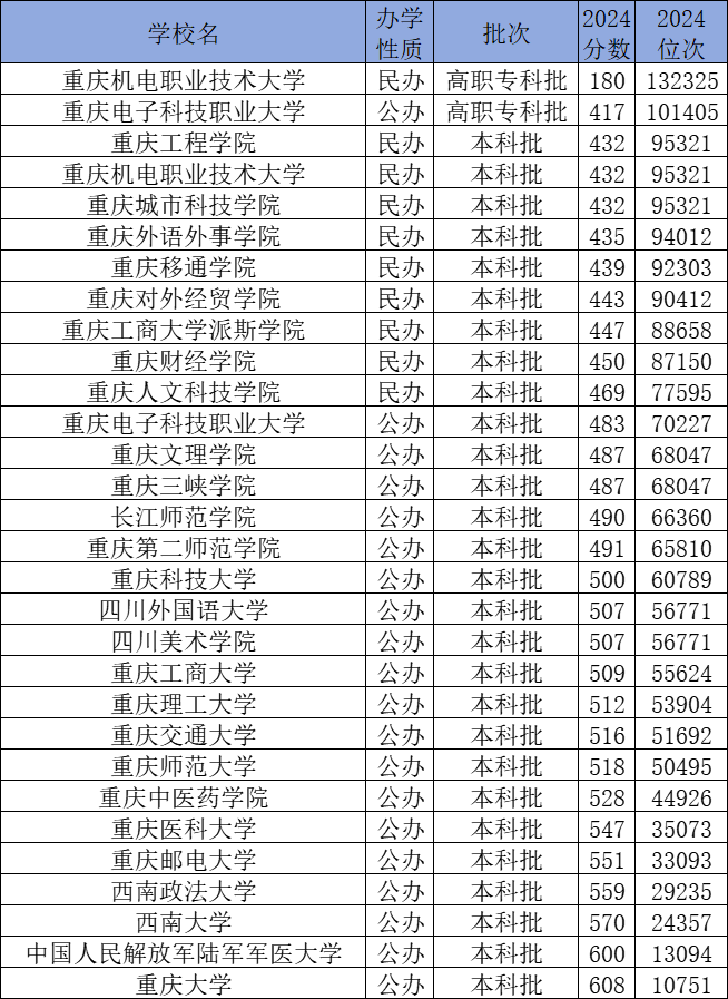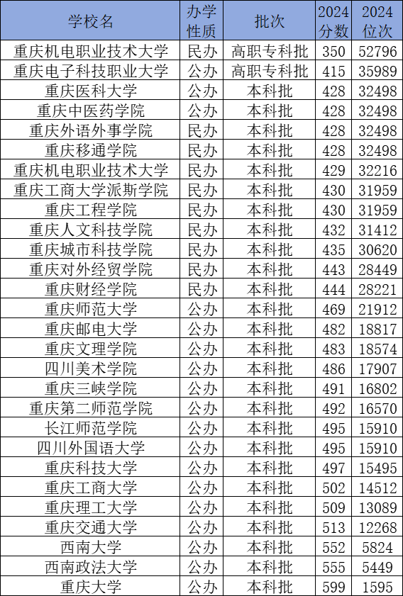 注:因为全国院校在重庆录取数据较多,本文篇幅受限,只能为大家整理出重庆内高校在重庆的最低录取分数线(不含特殊类型专业),供2025年考生参考。