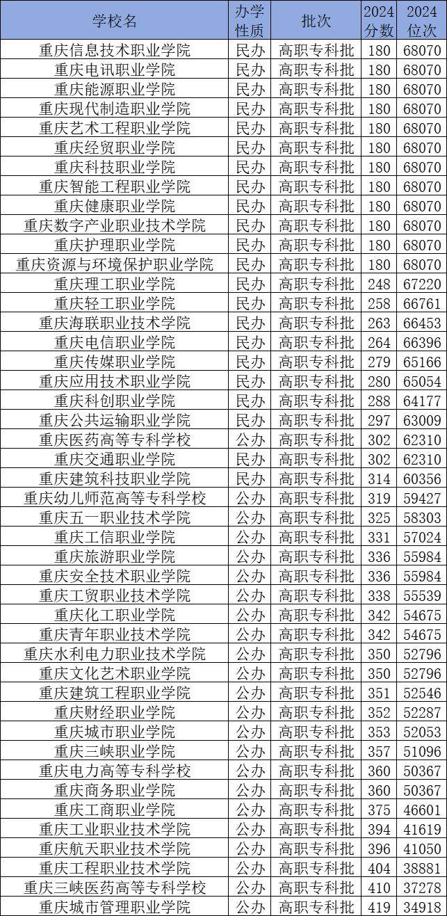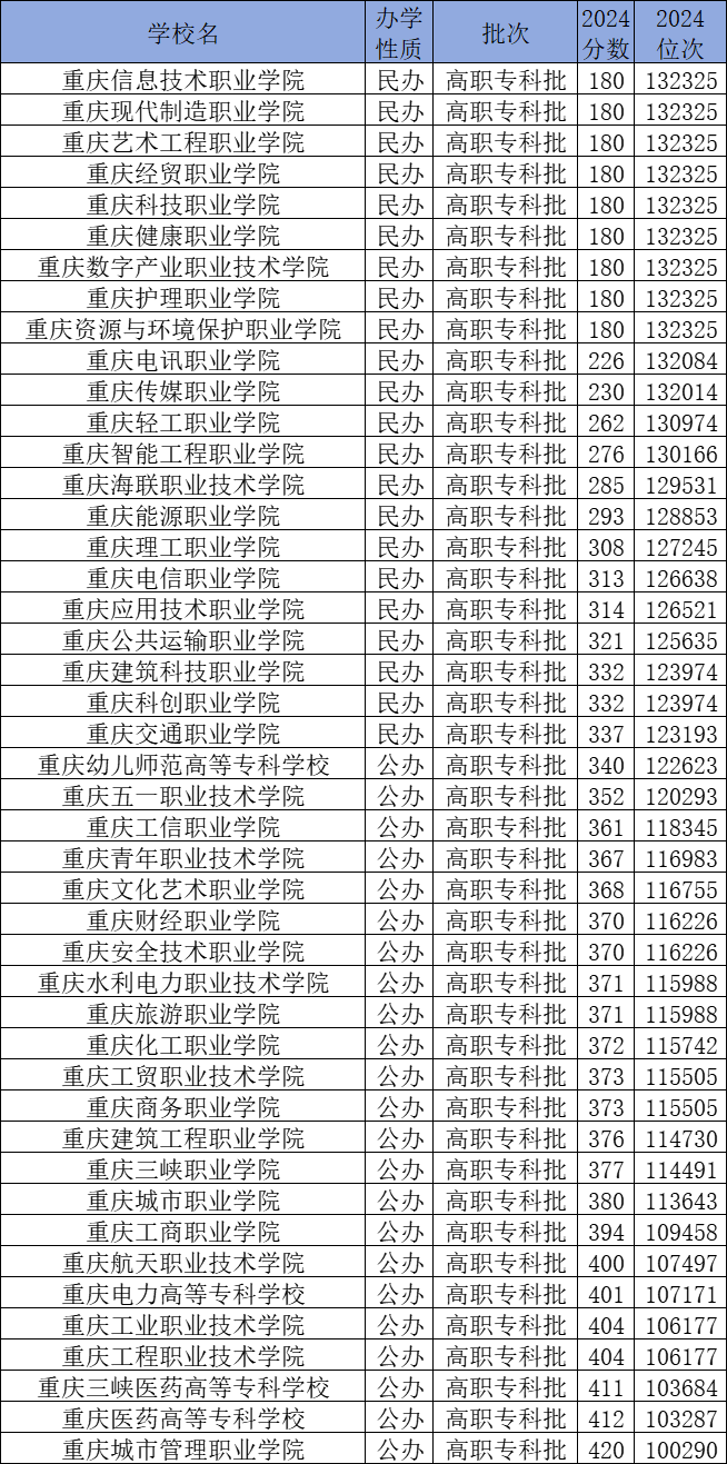 录取分数线最低、最好考的专科高校是重庆信息技术职业学院、重庆现代制造职业学院、重庆艺术工程职业学院等,2024最低分数线为180分,位次为132325名。