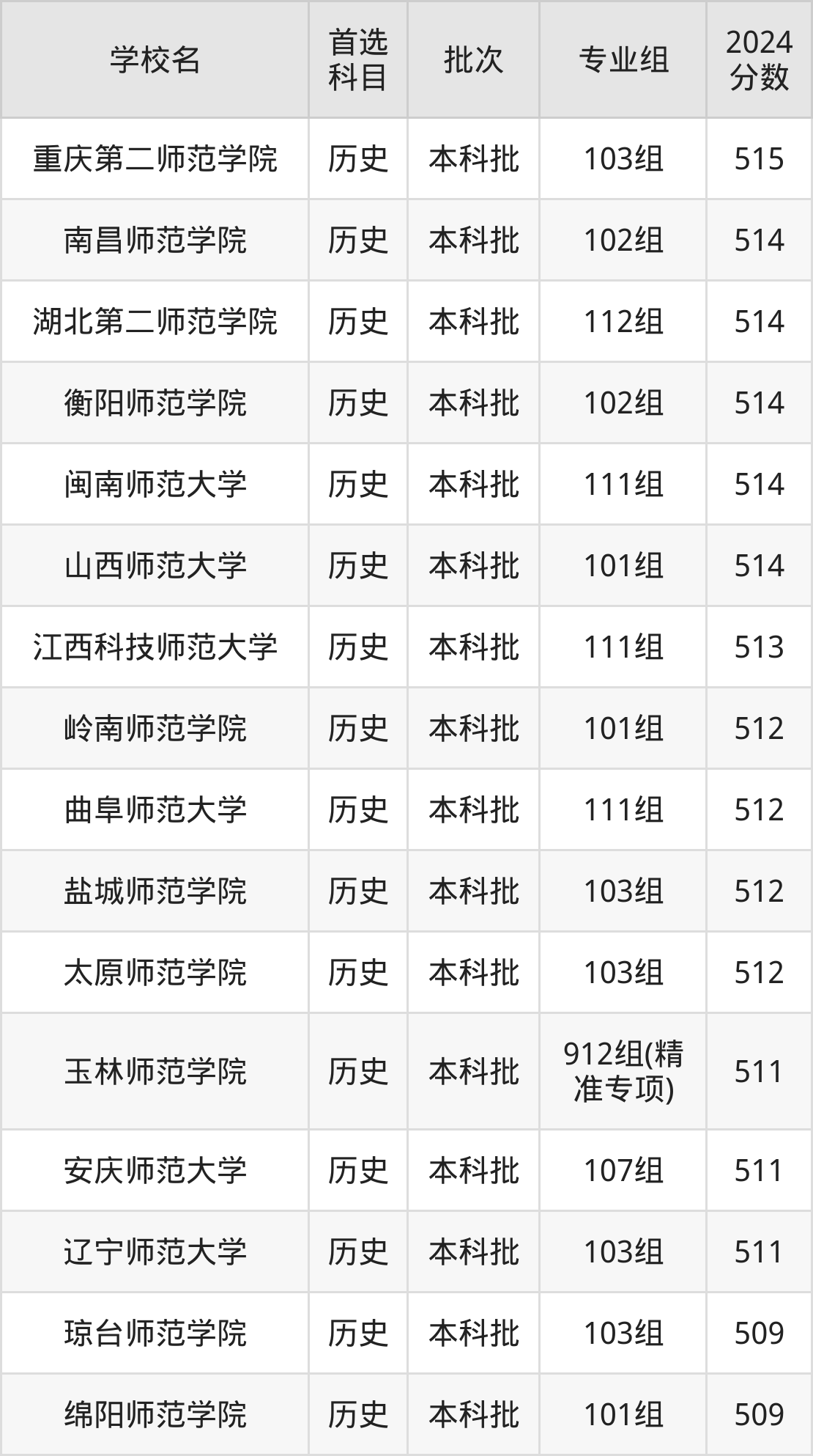 首选历史科目考生能上的有20所,全部在本科批次录取。具体有:重庆第二师范学院103组(515分)、南昌师范学院102组(514分)、湖北第二师范学院112组(514分)、衡阳师范学院102组(514分)等;