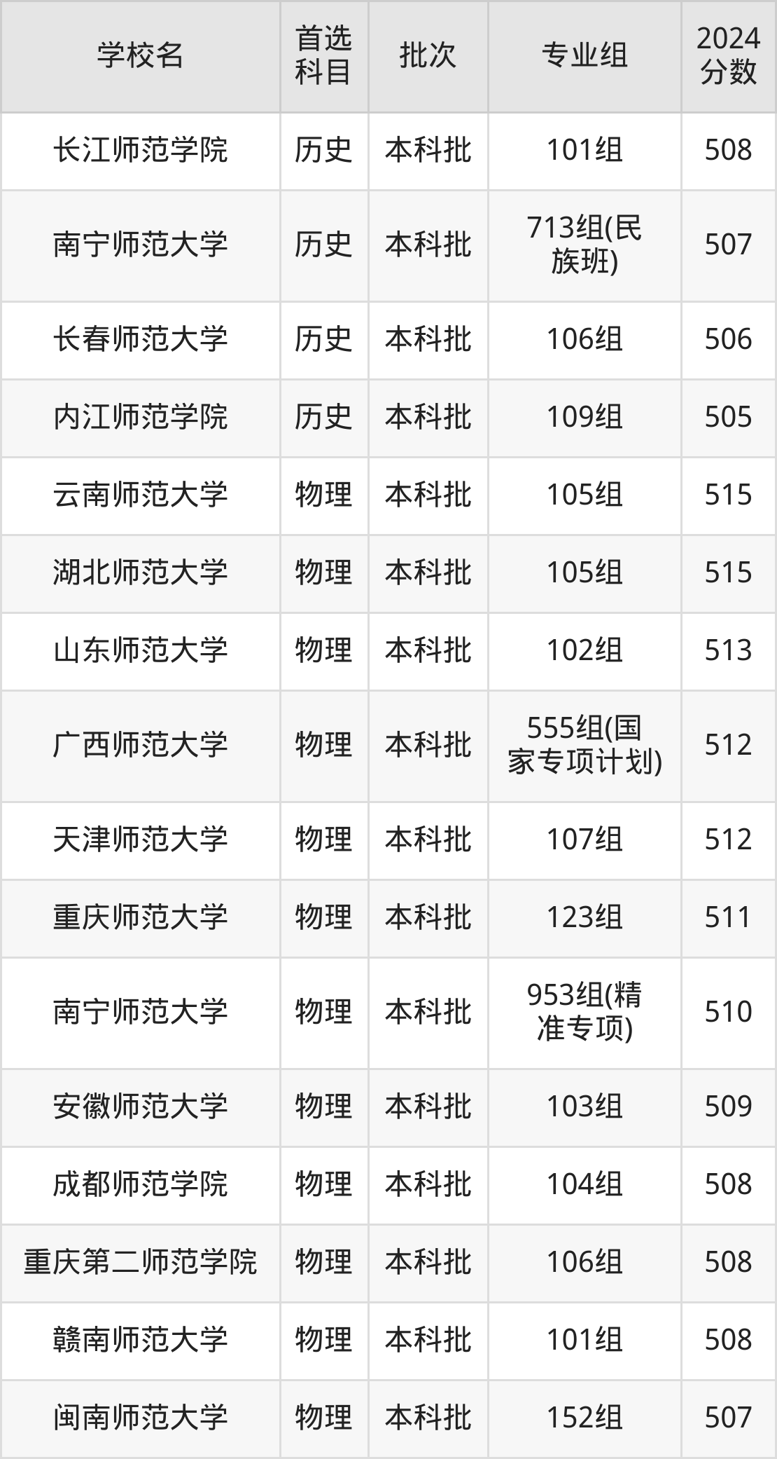 首选物理科目考生能上的有16所,全部在本科批次录取。具体有:云南师范大学105组(515分)、湖北师范大学105组(515分)、山东师范大学102组(513分)、广西师范大学555组(国家专项计划)(512分)等。