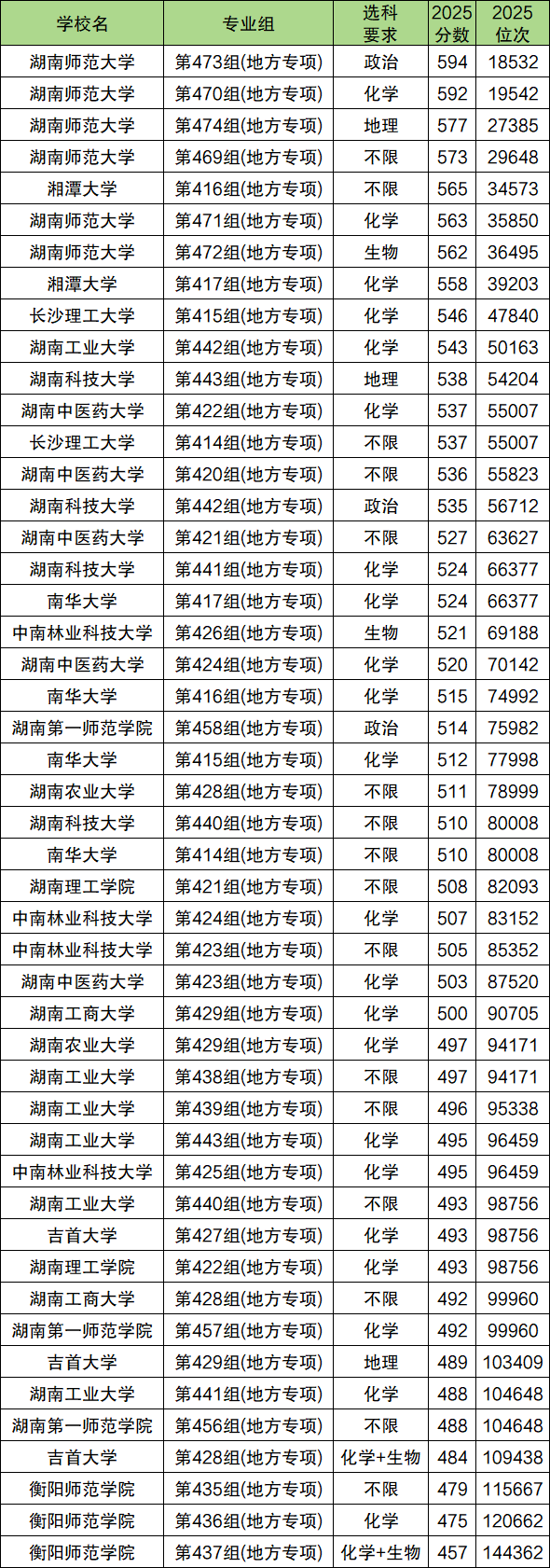 湖南师范大学:第470组,2025年592分,选科要求为化学;