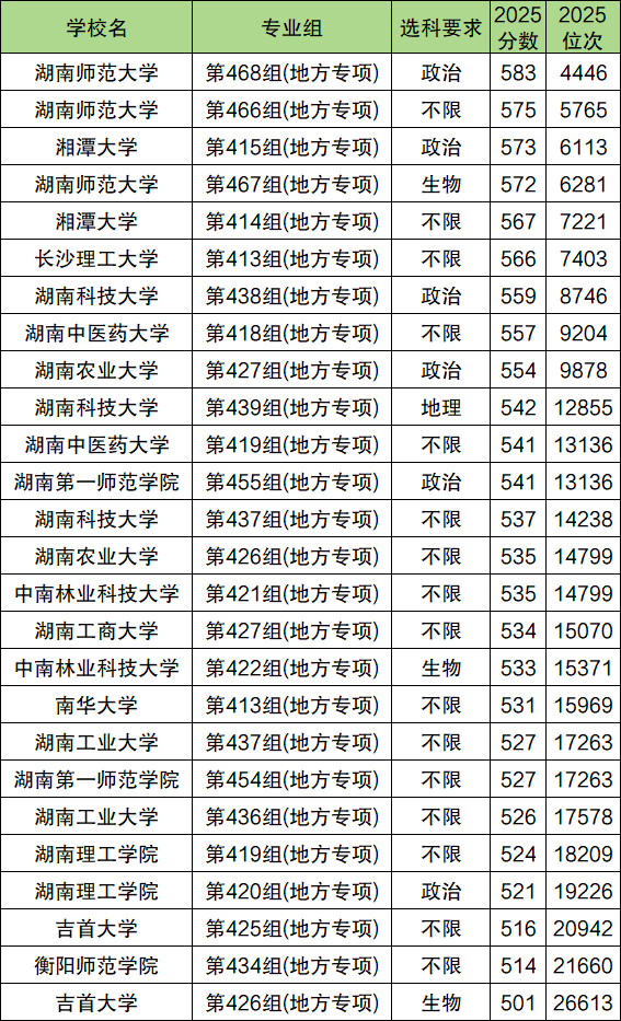2025年湖南地方专项计划历史类招生院校专业组一共有26个,录取分数线最低从501分到583分,最低分和最高分院校分别是:吉首大学第426组、湖南师范大学第468组。